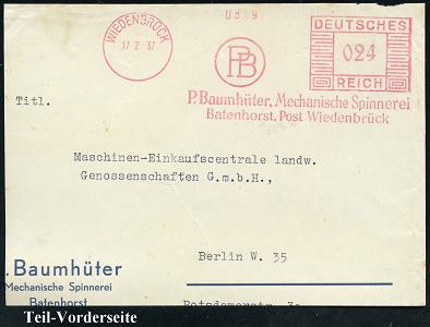 8686 | 16 € | PL-Raum 48.. (ohne Bielefeld) : WIEDENBRÜCK/ PB/ P.Baumhüter,Mechan.Spinnerei/ Batenhorst.. 1937 (17.2.) AFS Francotyp "Mäanderrechteck" (Monogr.-Logo) Firmen-Teil-Vorderseite (Dü.E-2CEh) | ![]() | |