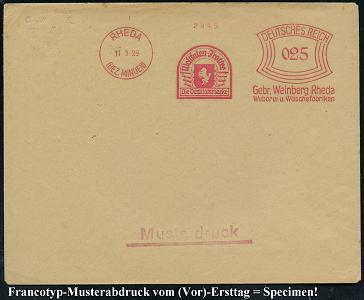 8668 | 35 € | PL-Raum 48.. (ohne Bielefeld) : RHEDA/ (BEZ.MINDEN)/ Westfalen-Frottee/ ..Gebr.Weinberg../ Weberei.. 1929 (11.3.) AFS-Musterabdruck Francotyp "Bogenrechteck" (Pferde-Wappen) glasklar gest. Francotyp-Musterbf. vom (Vor)-Ersttag !, (Dü.E-1CAh = frühe C-Maschine!) | ![]() ![]() | |