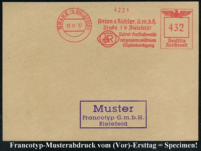 8623 | 35 € | PL-Raum 48.. (ohne Bielefeld) : BRAKE (b BIELEFELD)/ Anton & Richter GmbH../ Patent-Freiflußventile/ mit..Elllipsendurchgang 1937 (15.11.) AFS-Musterabdruck Francotyp "Reichsadler" (Monogr.-Logo) glasklar gest. Francotyp-Musterblatt vom (Vor)-Ersttag !, selten! (Dü.E-5CGh) | ![]() ![]() | |