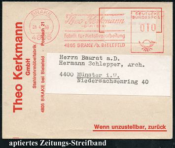 8625 | 18 € | PL-Raum 48.. (ohne Bielefeld) : 4805 BRAKE/ Thomas Kerkmann/ GMBH/ Fabrik für Metallverarbeitung.. 1969 (28.4.) AFS Francotyp "Posthorn" 010 Pf. auf überklebtem Zeitungs-Streifband (Feld "Gebühr bezahlt" überklebt) n. Münster (Dü.E-23CG) | ![]() | |