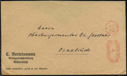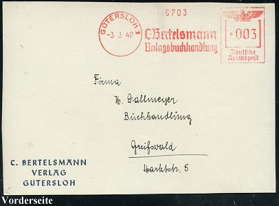 8635 | 16 € | PL-Raum 48.. (ohne Bielefeld) : GÜTERSLOH 1/ C.Bertelsmann/ Verlagsbuchhandlung 1942 (3.3.) AFS Francotyp "Reichsadler" auf Firmen-Vorderseite: (Dü.E-5DGh) | ![]() | |
