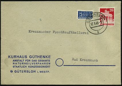 8638 | 15 € | PL-Raum 48.. (ohne Bielefeld) : GÜTERSLOH/ b 1949 (17.3.) 2K-Steg auf EF 20 Pf. Bauten + 2 Pf. NoB, Firmen-Bf.: KURHAUS GÜTHENKE / ANSTALT FÜR DAS GESAMT NATURHEILVERFAHREN.. | ![]() | |
