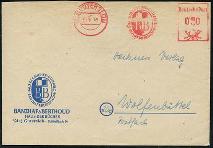 8639 | 15 € | PL-Raum 48.. (ohne Bielefeld) : (21a) GÜTERSLOH/ HAUS DER BÜCHER GÜTERSLOH/ BANZHAF & BERTHOUD 1949 (30.5) AFS Francotyp "Posthorn" (Monogr.-Logo mit aufgeschlagenem Buch) motivgl. Firmenbf. (rs. fehlt Klappe) n. Wolfenbüttel (Dü.E-20CG = C-Maschine mit "A"-Wertrahmen) | ![]() | |