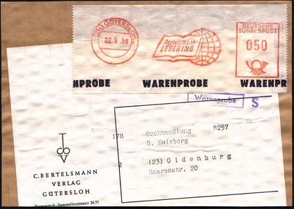 8642 | 28 € | PL-Raum 48.. (ohne Bielefeld) : (21a) GÜTERSLOH/ Bertelsmann/ LESERING 1958 (2.9.) AFS Francotyp "Posthorn" 050 Pf. auf Frankierstreifen "WARENPROBE" (offenes Buch, Globus) Firmen-Adreß-Aufkleber, seltene Portostufe = höchste Gew.Stufe "Warenprobe" (Götz ca. + 150.- DM, 1980) | ![]() | |