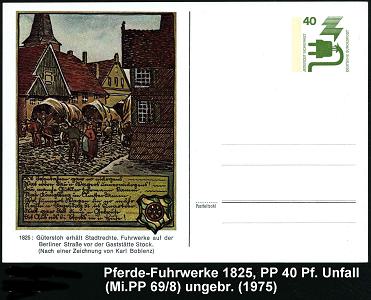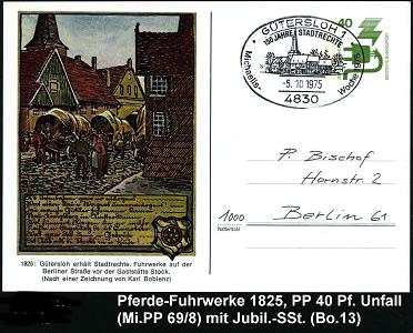 8653 | 8 € | PL-Raum 48.. (ohne Bielefeld) : Gütersloh 1975 (Okt.) PP 40 Pf. Unfall, grün: 1825 Gütersloh erhält Stadtrecht, Fuhrwerke.. (u Stadtwappen) ungebr. (Mi.PP69/8) | ![]() | |