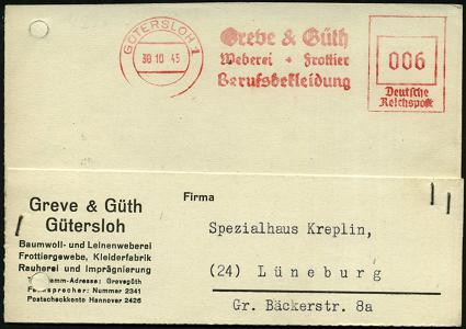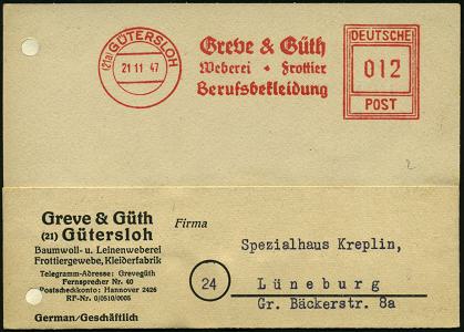 8636 | 30 € | PL-Raum 48.. (ohne Bielefeld) : (21a) GÜTERSLOH/ Grebe & Güth/ Weberei../ Berufskleidung 1945/47 aptierter AFSReichsadler "Reichsadler" = entfernt = Notmaßnahme bzw. Francotyp "Hochrechteck" m. PLGZ (= Nachfolge-Wertrahmen) 2 Firmen-Karten (je Reg.-Lochung geschl.) 1x Text über Mangelwirtschaft etc. 2 Belege in Entwicklungsdarstellung! (Dü.E-13 J-129o, E-18CG, nur 1946-47 verwendet!) | ![]() ![]() | |