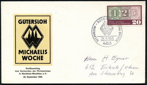 8648 | 14 € | PL-Raum 48.. (ohne Bielefeld) : 483 GÜTERSLOH/ MW/ MICHAELIS WOCHE 1965 (26.9.) SSt (Monogr.-Logo mit Kirche) motivgl. Sonderumschlag | ![]() | |