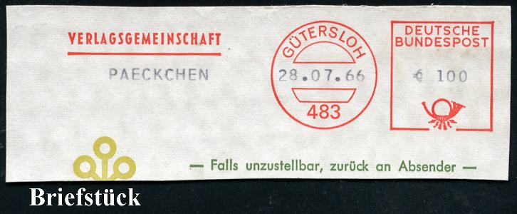 8649 | 15 € | PL-Raum 48.. (ohne Bielefeld) : 483 GÜTERSLOH/ VERLAGSGESELLSCHAFT 1966 (28.7.) EDV-Freistempel auf gedrucktem Wertrahmen "Posthorn" 100 Pf. = Bertelsmann , kleies Briefstück = Postautomation! (Dü.J-1, Nr.1 = Erstjahr!) | ![]() | |