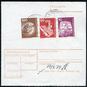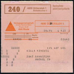 8656 | 12 € | PL-Raum 48.. (ohne Bielefeld) : 4830 GÜTERSLOH 1 1979 (Sept.) EDV-Freistempel 420 Pf. mit Monat/Jahr + kl. Posthorn auf Selbstbucher-NN-Kt.: 4830 Gütersloh 1, Selbstbucher 1 = Bertelsmann n. Bannstorf, rs. Frankatur 170 Pf. Zustellgebühr (Dü.J-2, Nr.2) | ![]() ![]() | |