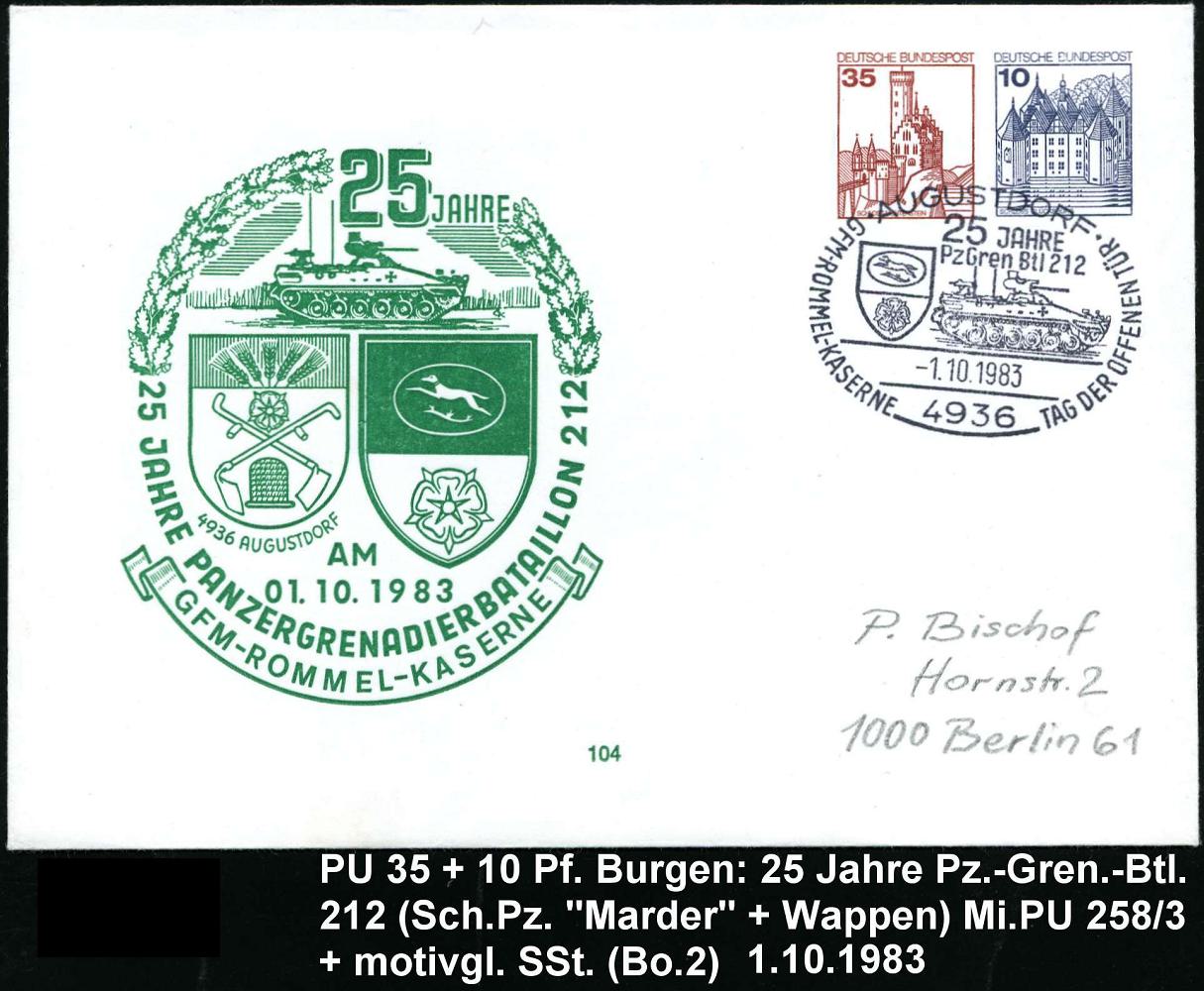 8741 | 12 € | PL-Raum 49.. (ohne Herford) : 4936 AUGUSTDORF/ 25 JAHRE/ PzGren Blt 212.. 1983 (1.10.) SSt = Schützen-Panzer "Marder" auf motivgl. PU 35 Pf. + 10 Pf. Burgen: SchPz "Marder" (+ Wappen) Inl.-Bf. (Mi.PU 258/3) | ![]() | |