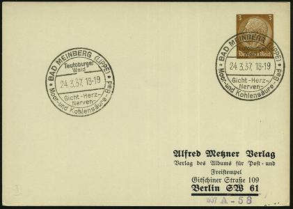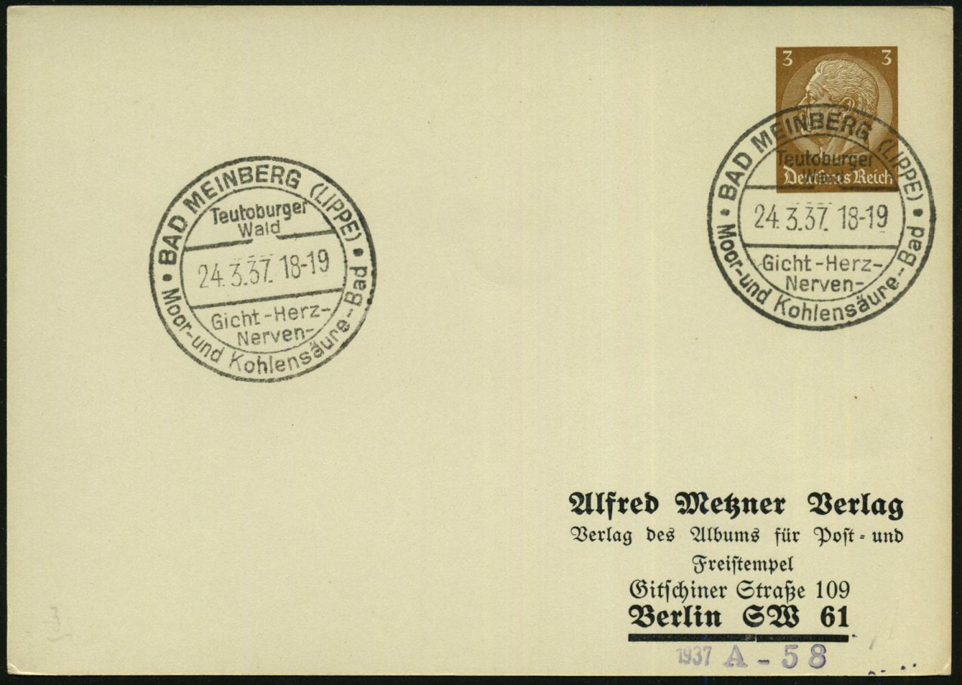8743 | 18 € | PL-Raum 49.. (ohne Herford) : BAD MEINBERG (LIPPE)/ ..Gicht-Herz-/ Nerven-/ Moor- u.Kohlensäure-Bad 1937 (24.3.) HWSt auf PP 3 Pf. Hindenbg., braun: Alfred Metzner Verlag.. (Mi.PP 122/B 9) klar gest. Inl.-Karte (Bo.1) | ![]() | |