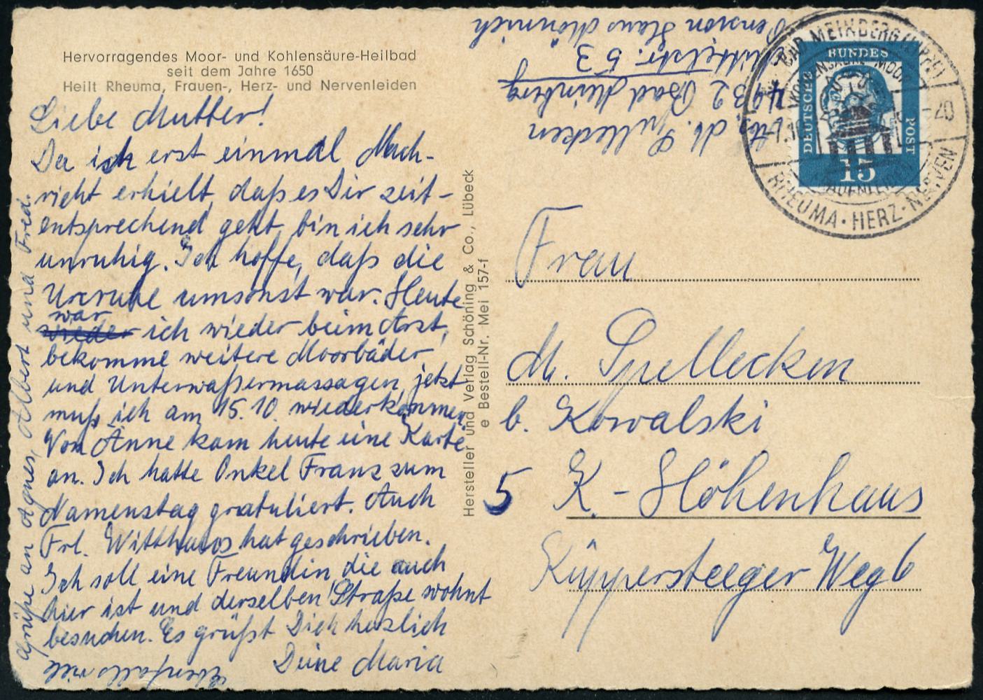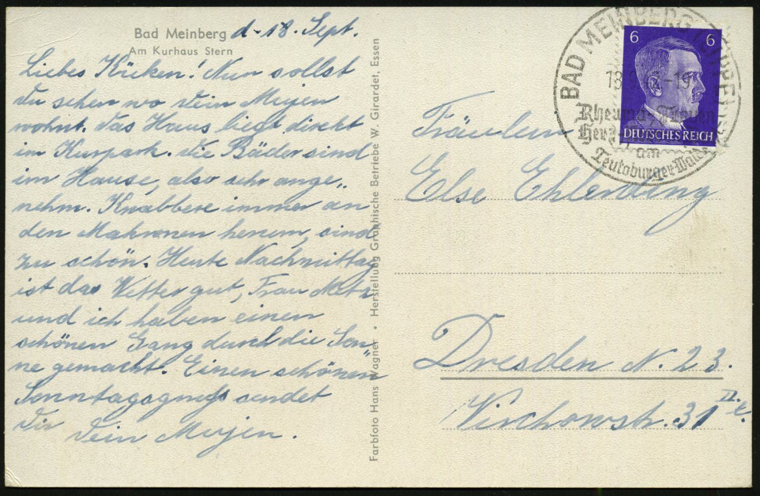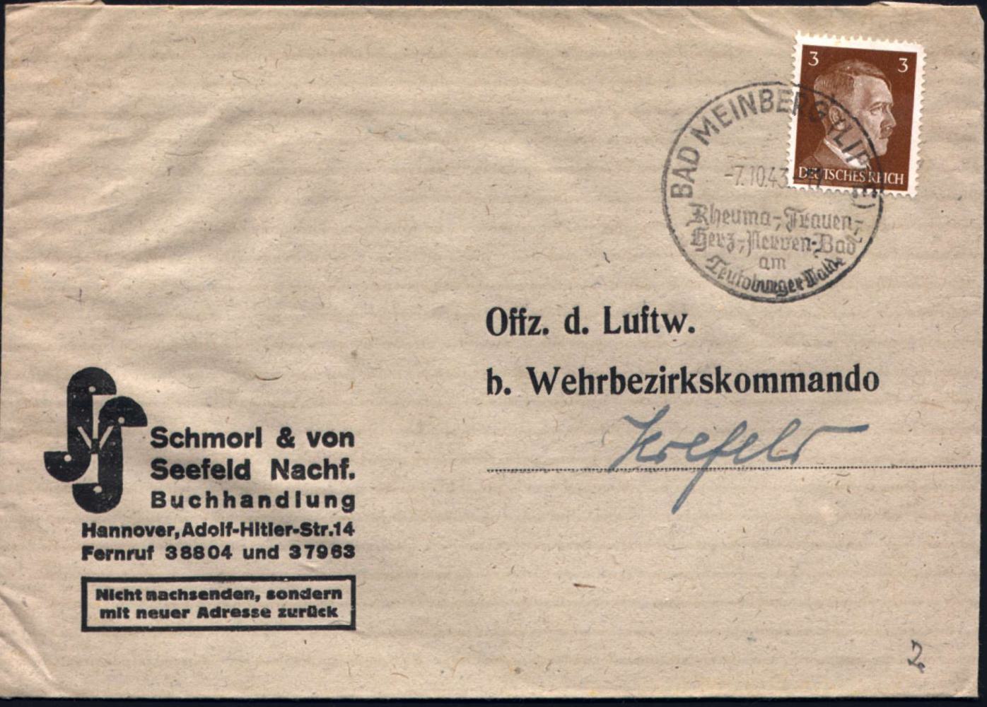 8744 | 20 € | PL-Raum 49.. (ohne Herford) : BAD MEINBERG(LIPPE)/ Rheuma-,Frauen-/ Herz-Nerven-Bad.. 1943 (7.10.) HWSt klar auf frankiertem Wehrmachts-Firmen-Bf.: Fa. Schmorl & von Seefeld.. Buchhandlung an. Wehrbezirks-Kdo. Krefeld, keine Portofreiheit! (Bo.2 , Bo. 1943 unbekannt!) | ![]() | |