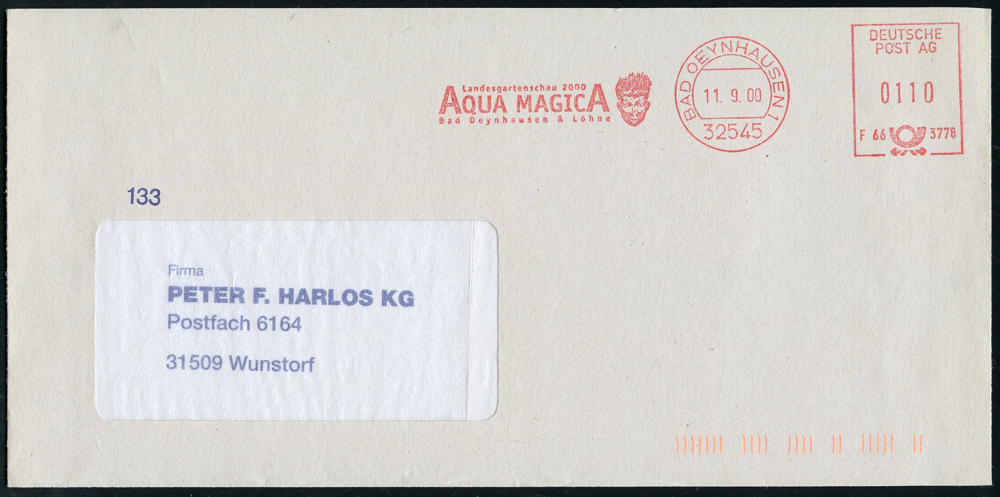 8757 | 10 € | PL-Raum 49.. (ohne Herford) : 32545 BAD OEYNHAUSEN 1/ F66 3778/ Landesgartenschau 2000/ AQUA MAGICA.. 2000 (11.9.) AFS Postalia "DEUTSCHE POST AG" = bewachsener Kopf , Kommunal-Bf. (Dü.E-26B, nur kurze Verwendung!) | ![]() | |