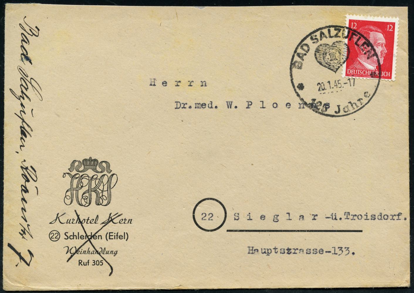 8759 | 20 € | PL-Raum 49.. (ohne Herford) : BAD SALZUFLEN/ 125 Jahre 1945 (12.2) später HWSt (Herz mit .Brunnentempel) klar gest. Fernbf.: Kurhotel Kern (22) Schleiden (Eifel) privat verwendet (Bo.4 ,Bo. 1945 unbekannt!) | ![]() | |
