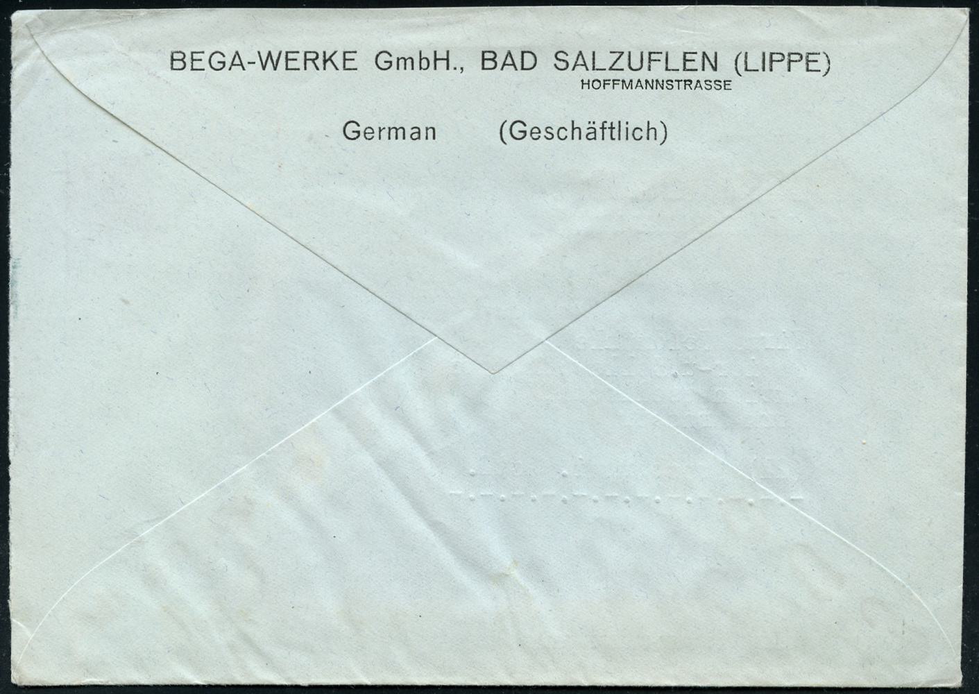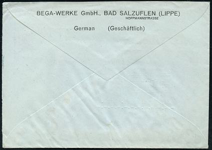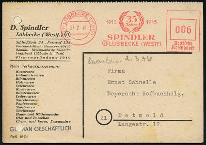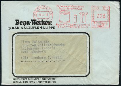 8760 | 38 € | PL-Raum 49.. (ohne Herford) : BAD SALZUFLEN/ Kartonnagen-Erzeugung/ ..BEGA-WERKE GmbH. 1946 (19.2.) aptierter AFS Francotyp "Hakenkreuz" = entfernt = Notmaßnahme! (div. Kartonnagen) Firmen-Bf.: Bega-Werke GmbH.., rs. Abs.-Vordruck (Dü.E-12 H-98o = sehr seltene Type!) | ![]() ![]() | |