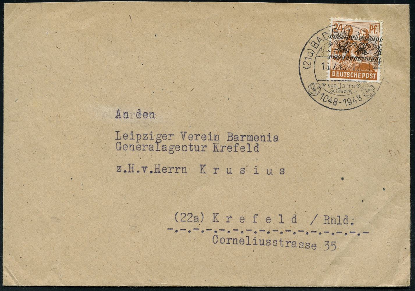 8761 | 18 € | PL-Raum 49.. (ohne Herford) : (21a) BAD SALZUFLEN/ 900 Jahre/ Salzwerk/ 1048-1948 1949 (21.6.) HWSt = Salzbergwerks-Brunnen auf EF 24 Pf. Arbeiter + Posthorn-Netz-Aufdruck , Firmen-Bf. (rs. Klappenriß geschl.) n. Krefeld (Bo.5) | ![]() | |