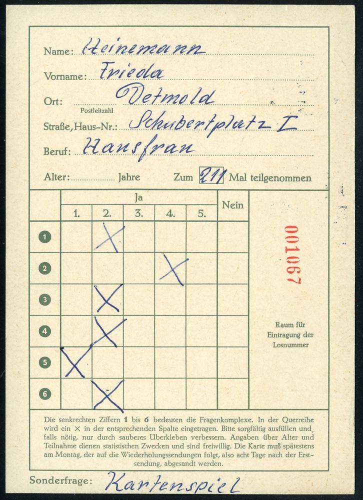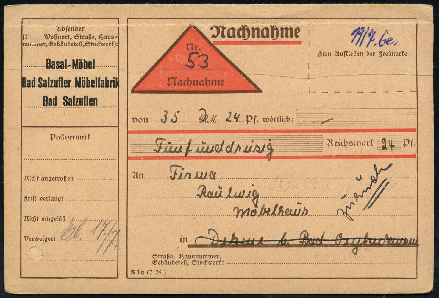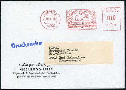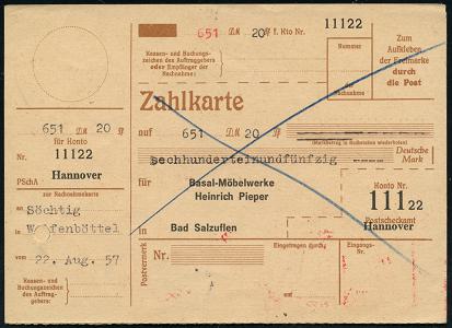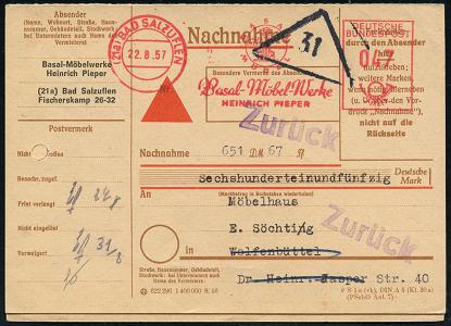 8764 | 18 € | PL-Raum 49.. (ohne Herford) : (21a) BAD SALZUFLEN/ ..Basal-Möbel-Werke/ HEINRICH PIEPER 1957 (22.8.) AFS Francotyp 047 Pf. (Firmen-Logo) + 2x viol. 1L: Zurück , Nachnahme-Doppel-Klappkarte (rs. Zahlkarte, 1x Reg.-Lochung geschl.), Retour-Beleg! (Dü.E-23CO) | ![]() ![]() | |