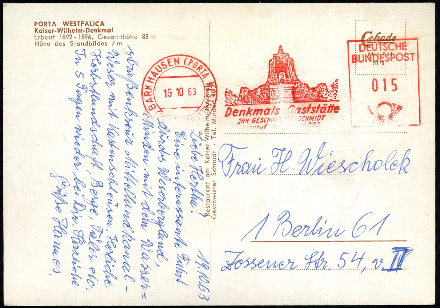 8766 | 20 € | PL-Raum 49.. (ohne Herford) : (21a) BARKHAUSEN (PORTA WESTFALICA)/ Denkmals-Gaststätte.. 1963 (19.10.) AFS Postalia = Kaiser-Wilhelm-Denkmal = Hauspostamt Gaststätte, zulässige Fremdnutzung eines Firmen-Freistemplers durch einen Gast (sonst unzulässig) Color-Foto-Ak.: Kaiser-Wilhelm-Denkmal (+ 4 Ansichten) Bedarfs-Kt. n. West-Berlin (Dü.E-23B, vergl. Kat.Nr.8765, 8865-68) | ![]() ![]() ![]() | |