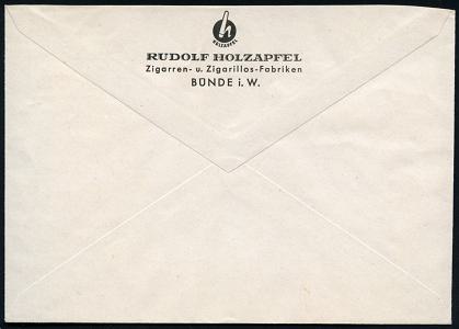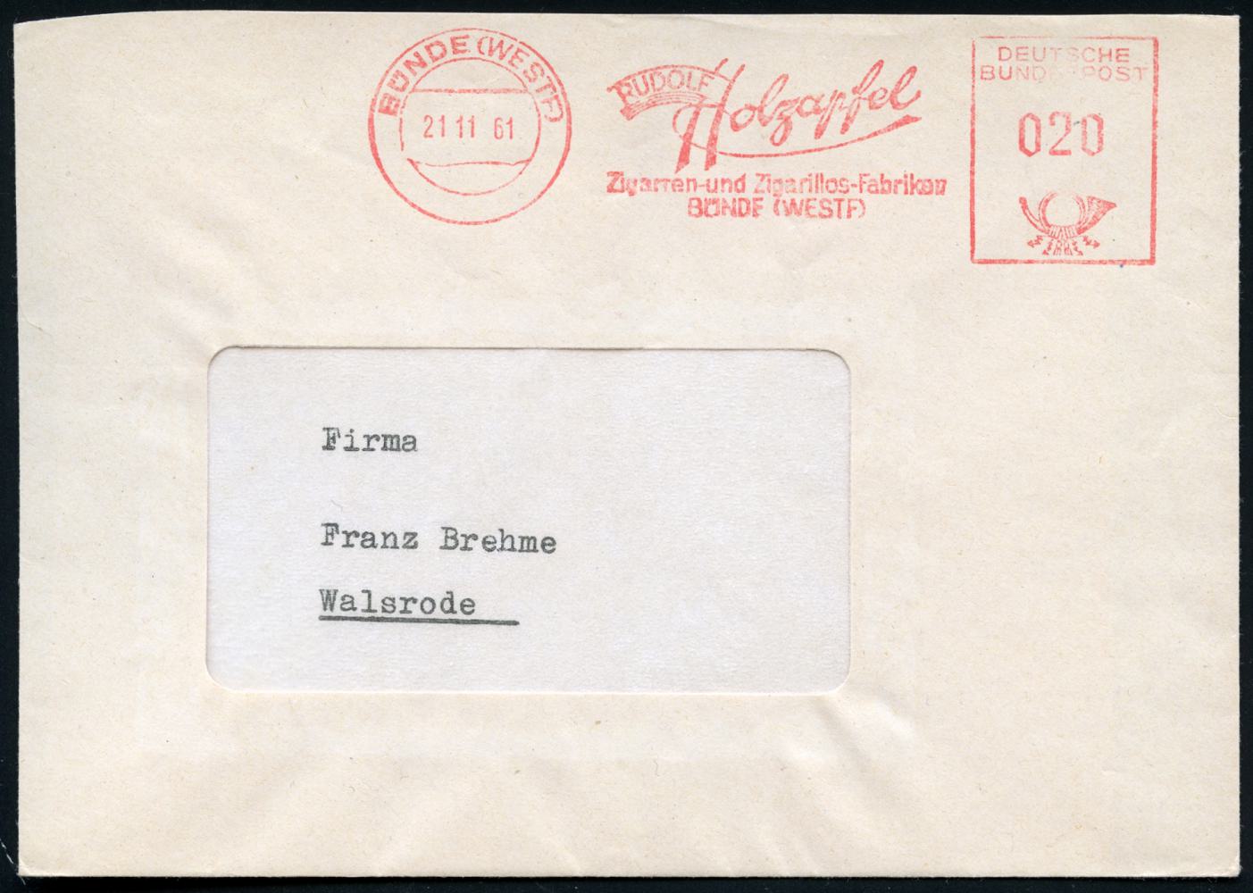 8777 | 12 € | PL-Raum 49.. (ohne Herford) : BÜNDE (WESTF)/ RUDOLF Holzapfel/ Zigarren-u.Zigarillos-Fabriken 1961 (21.11.) AFS Francotyp ohne PLZ , rs. Abs.-Vordruck (mit Firmenlogo) Fernbf. (Dü.E-23CG) | ![]() ![]() | |