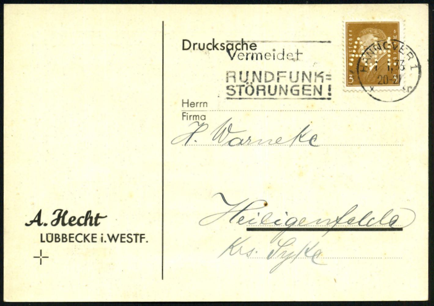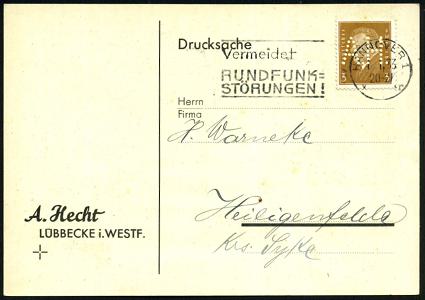 8824 | 16 € | PL-Raum 49.. (ohne Herford) : Lübbecke / Hannover 1933 (1.1.) Serien-MWSt.: HANNOVER 1/x x/Vermeidet/RUNDFUNK/STÖRUNGEN ! auf Ef 3 Pf. Ebert mit Firmenlochung: "A. H." = A. H (echt), LÜBBECKE i. WESTF. = Besuchsanzeigen-Drs.-Kt.! n. Heiligenfelde (Mi.410 EF, Perfin) | ![]() ![]() | |