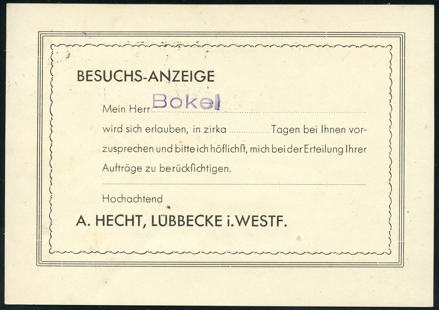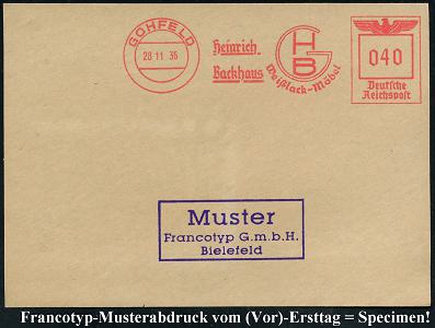 8802 | 35 € | PL-Raum 49.. (ohne Herford) : GOHFELD/ Heinrich/ Backhaus/ HBG/ Weißlack-Möbel 1936 (28.11.) AFS-Musterabdruck Francotyp "Reichsadler" (Monogr.-Logo) glasklar gest. Francotyp-Musterblatt vom (Vor)-Ersttag !, selten! (Dü.E-3CGo) | ![]() ![]() | |