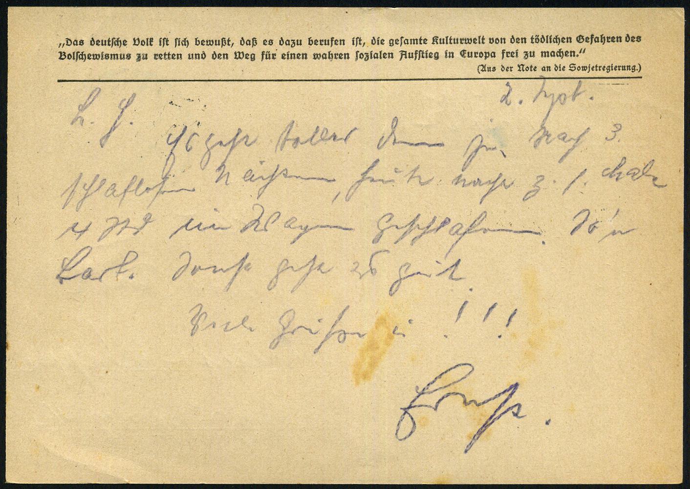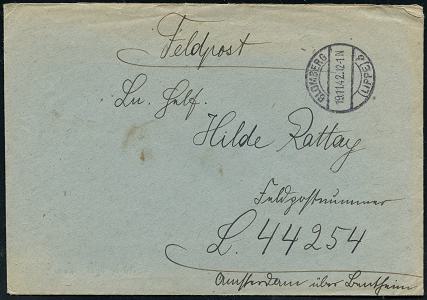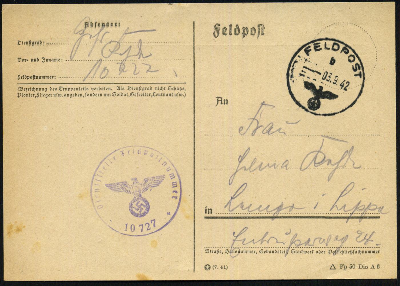 8815 | 12 € | PL-Raum 49.. (ohne Herford) : Lemgo 1942 (3.9.) Feldpost-1K: FELDPOST/b/--- + viol. 1K-HdN: Feldpostnr. 10727 = Kfz.-Transport-Kolonne "Koch" + hs. Abs., Feldpost-Kt. mit Propaganda-Text rs. (kl. Fleckchen) nach Lemgo ! | ![]() ![]() | |