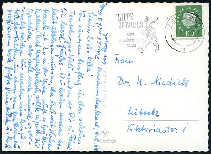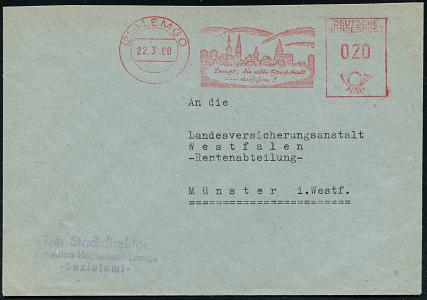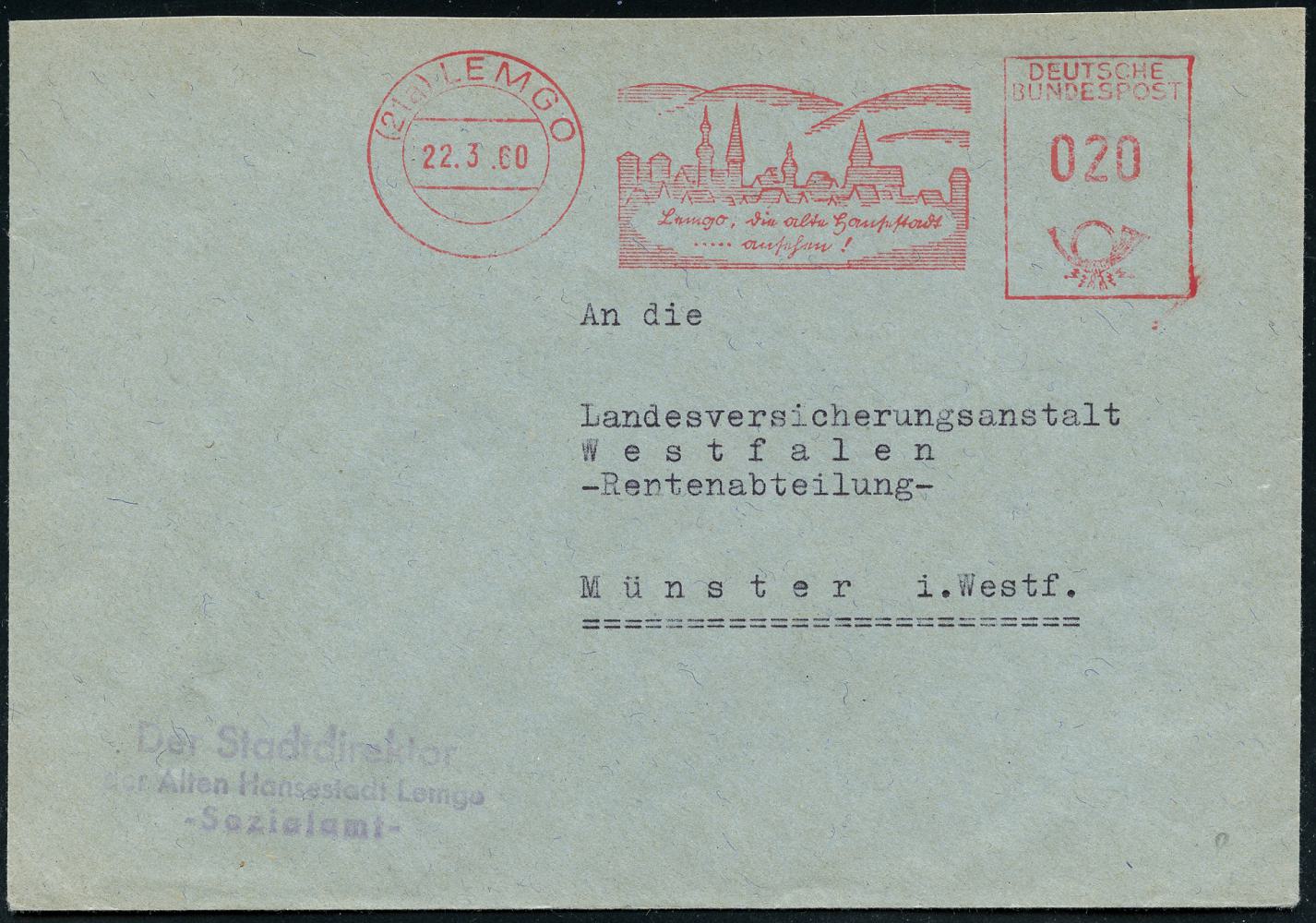 8816 | 12 € | PL-Raum 49.. (ohne Herford) : (21a) LEMGO/ ..die alte Hansestadt/ ..ansehen! 1960 (22.3.) AFS Francotyp, Text Sütterlin! = Stadtsilhouette + Abs.-3L: Der Stadtdirektor.., Fernbf. (Dü.E-20CO) | ![]() | |