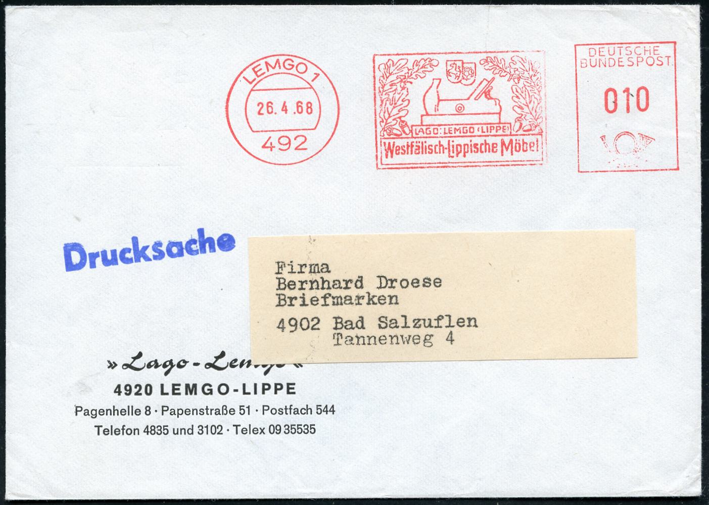 8817 | 14 € | PL-Raum 49.. (ohne Herford) : 492 LEMGO 1/ LAGO../ Westfäl.Lippische Möbel 1968 (26.4.) dekorativer AFS Francotyp (= Hobel mit Eichenlaub) Firmen-Bf.: "Lago - Lemgo".. (Dü.E-23CO) | ![]() | |