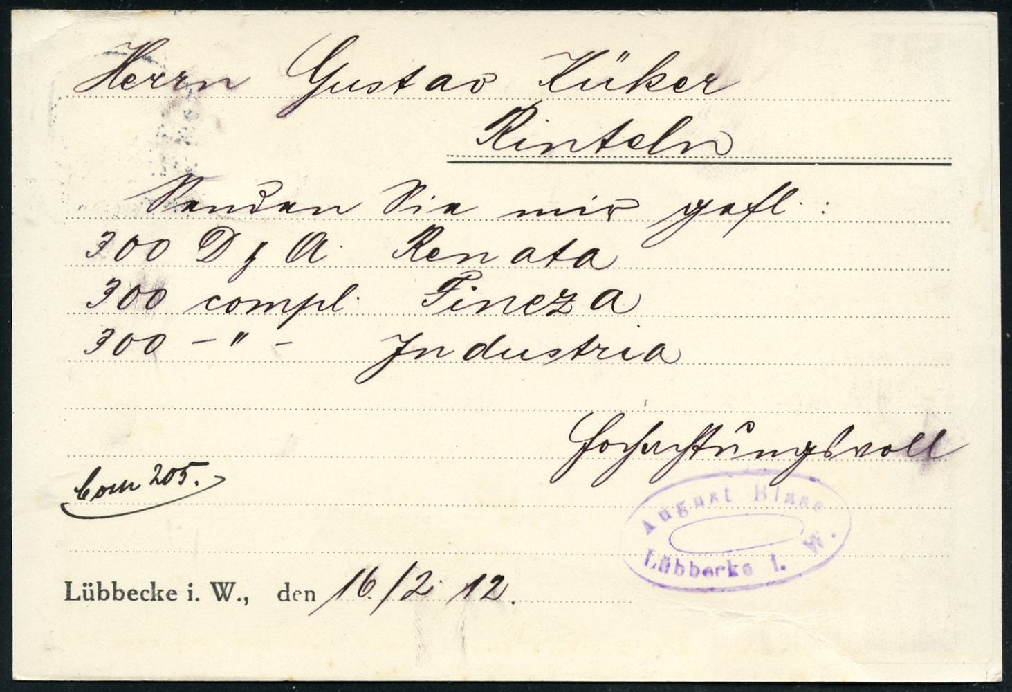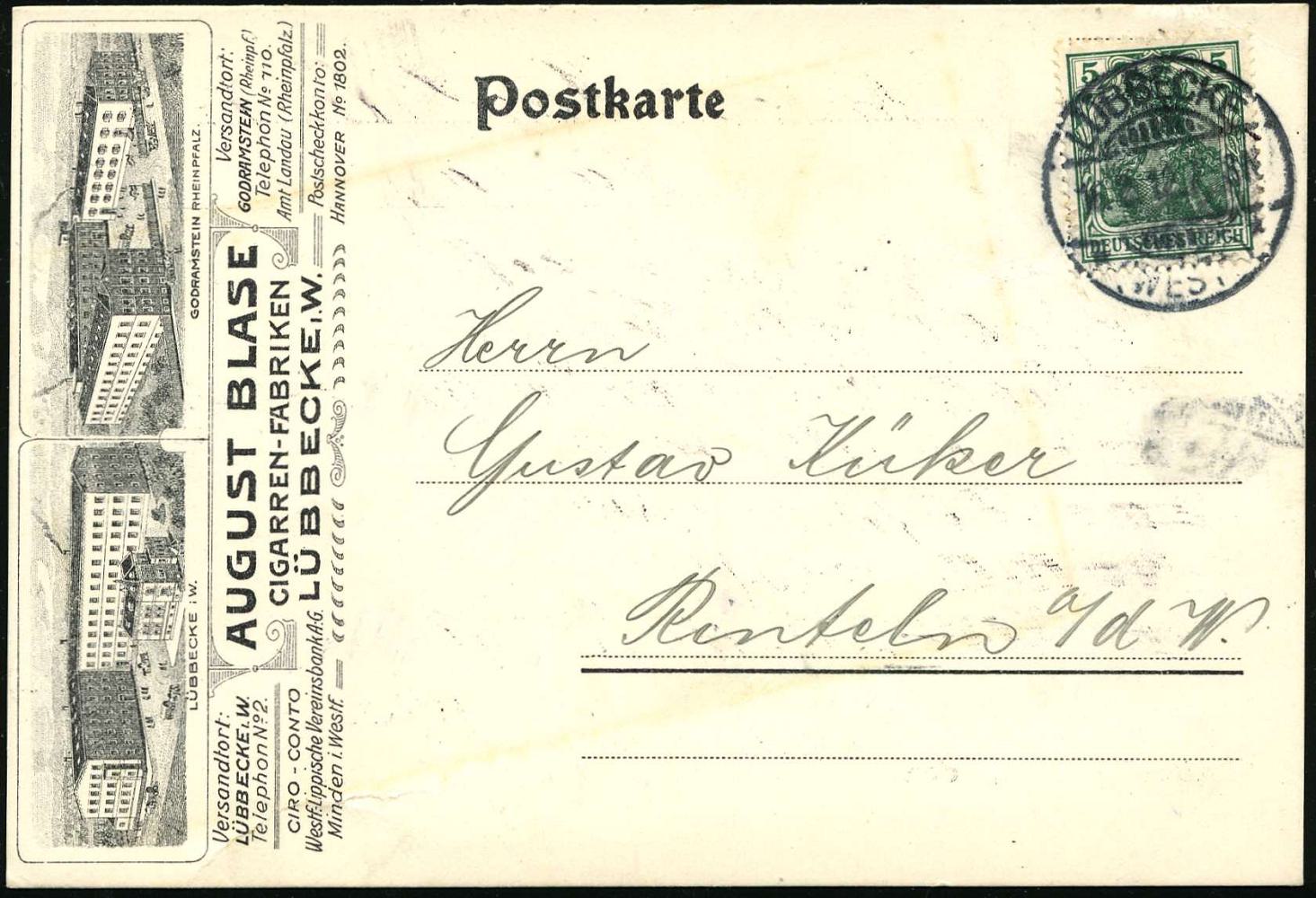 8823 | 25 € | PL-Raum 49.. (ohne Herford) : LÜBBECKE/ *(WESTF)* 1912 (16.1.) 1K-Gitter auf s/w.-Litho-Reklame-Kt.: AUGUST BLASE, CIGARREN-FABRIKEN (2 Ansichten) n. Rinteln, sehr dekorativ! (Mi.85 I, EF) | ![]() ![]() | |