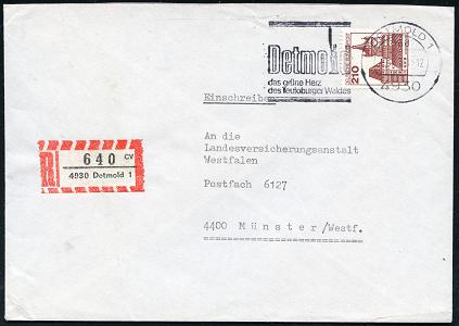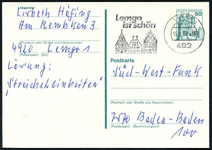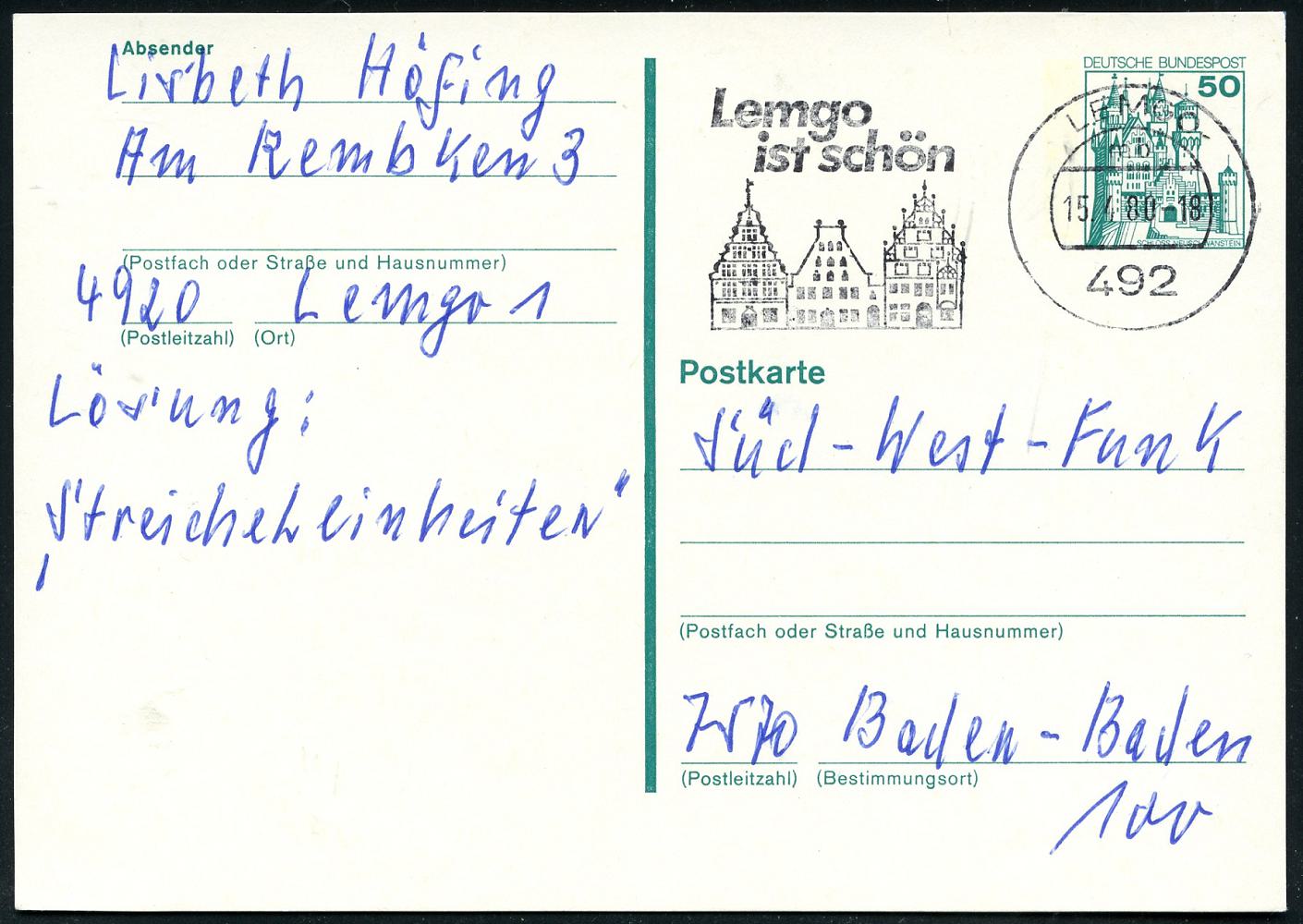 8819 | 6 € | PL-Raum 49.. (ohne Herford) : 492 LEMGO/ mb/ Lemgo/ ist schön 1980 (15.4.) MWSt (histor. Häuser der Hansestadt) Bedarfs-Kt. | ![]() | |