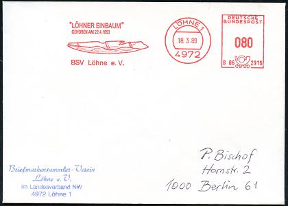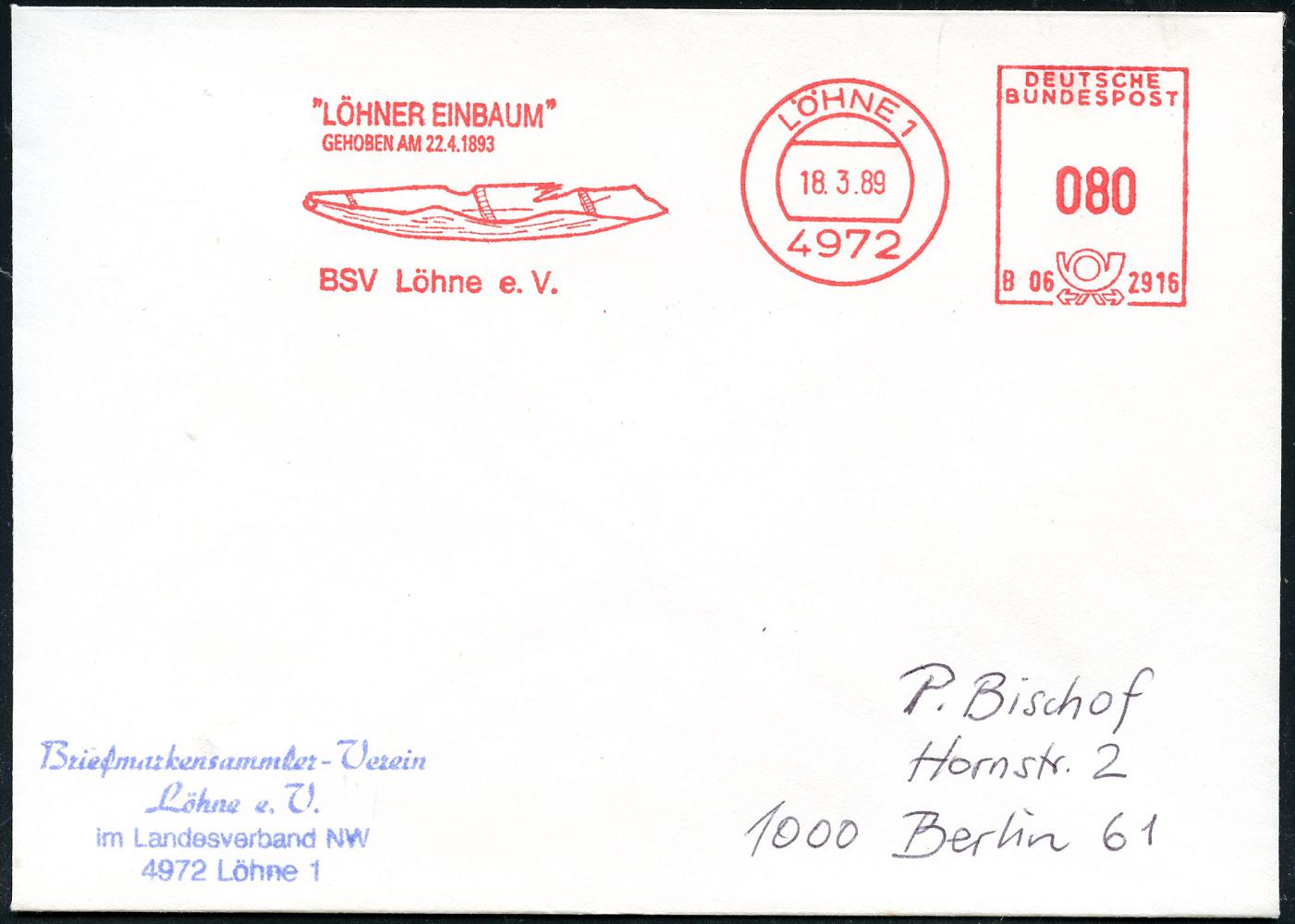 8822 | 12 € | PL-Raum 49.. (ohne Herford) : 4972 LÖHNE 1/ B06 2916/ "LÖHNER EINBAUM"/ GEHOBEN AM 22.4.1893.. 1989 (21.8.) AFS Francotyp = "Löhner Einbaum" (prähistor. Ur-Schiff) Inl.-Bf., vergl. Los 60 (Dü.E-26) | ![]() | |