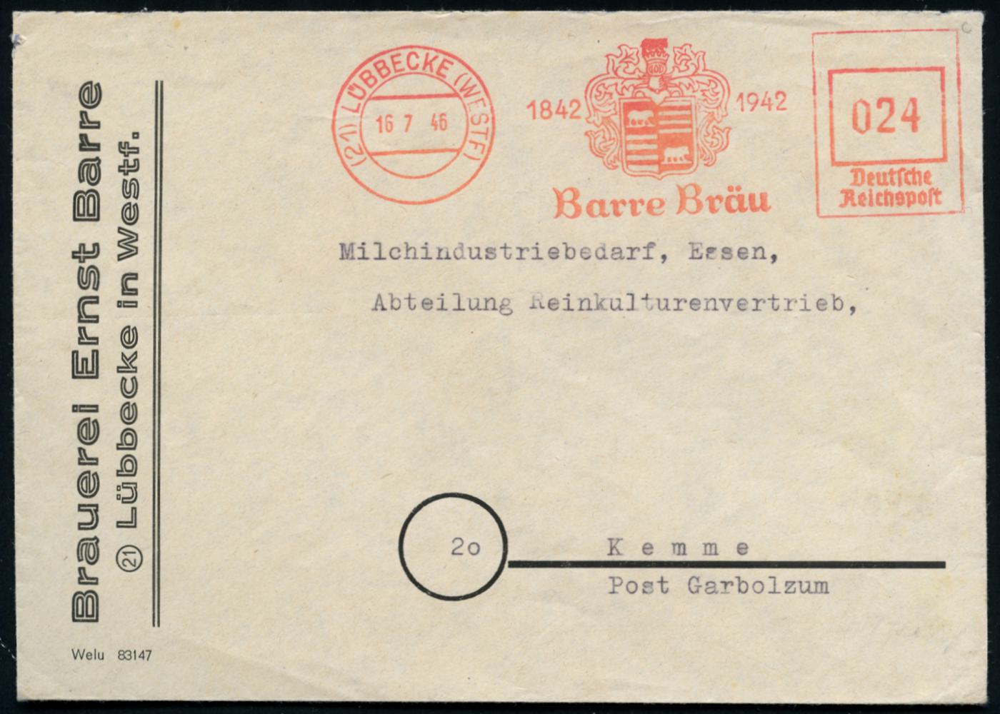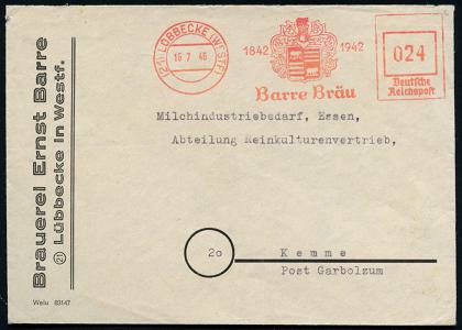 8828 | 25 € | PL-Raum 49.. (ohne Herford) : LÜBBECKE (WESTF)/ 1842 1942/ Barre Bräu 1946 (16.7.) aptierter Jubil.-AFS Francotyp "Reichsadler" = entfernt = Notmaßnahme (Wappen) glasklar gest. Firmen-Bf.: Brauerei Ernst Barre.. (Dü.E-13 J-129o) | ![]() | |