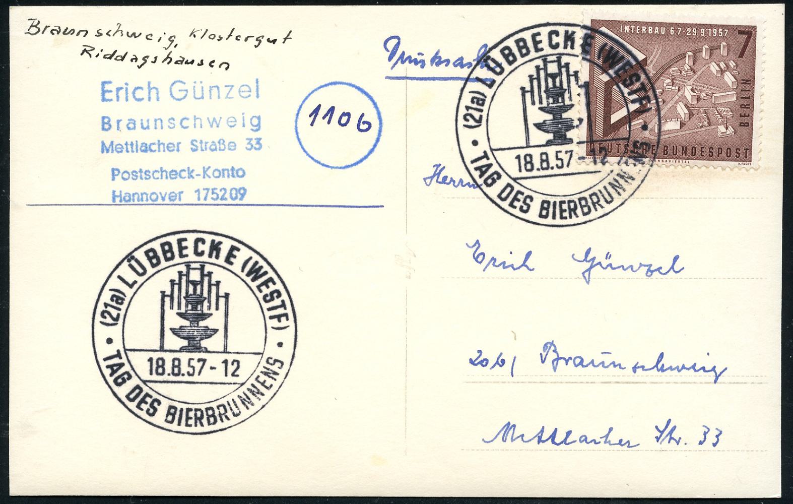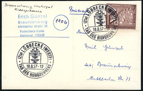 8831 | 16 € | PL-Raum 49.. (ohne Herford) : (21a) LÜBBECKE (WESTF)/ TAG DES BIERBRUNNENS 1957 (18.8.) HWSt (= Bierbrunnen) 2x glasklar auf s/w.-Foto-Ak. (unbekannte Ansicht) n. Braunschweig (Bo.2, III.Verwendung) | ![]() ![]() | |