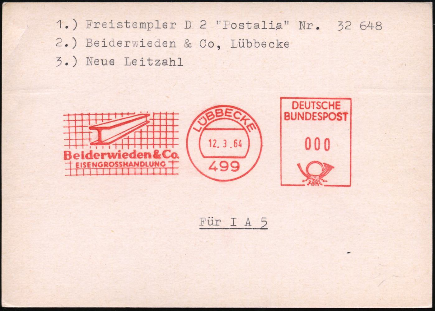 8834 | 20 € | PL-Raum 49.. (ohne Herford) : 499 LÜBBECKE/ Belderwieden & Co/ EISENGROSSHANDLUNG 1964 (12.3.) AFS Postalia in 000 Pf. Archiv-Muster = T-Träger , klar gest. postamtl. OPD-Archimuster-Karte mit amtl. Benutzerdaten = Unikat! (Dü.E-26 B) | ![]() ![]() | |