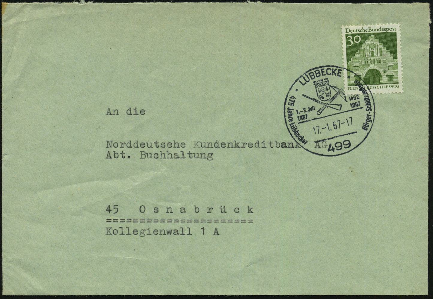 8836 | 15 € | PL-Raum 49.. (ohne Herford) : 499 LÜBBECKE/ 475 Jahre Lübbecker Bürger-Schützenfeste 1967 (17.1.) HWSt = 2 Gewehre (u. Wappen) klar gest. Inl.-Bedarfs-Bf. (Bo.5) | ![]() | |