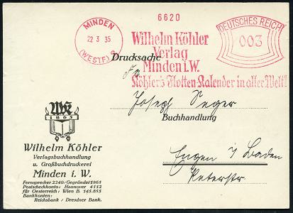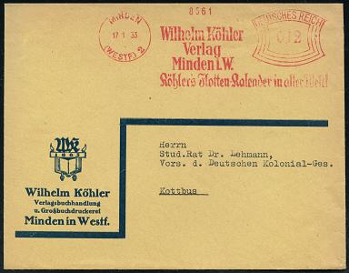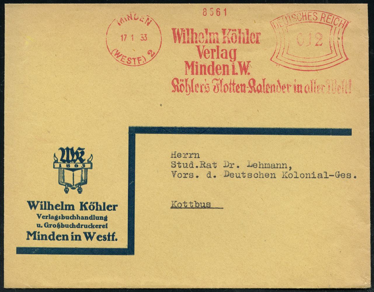 8842 | 25 € | PL-Raum 49.. (ohne Herford) : MINDEN/ (WESTF)2/ Wilhelm Köhler/ Verlag/ ..Köhlers Flotten-Kalender in aller Welt 1933 (17.1.) AFS Francotyp "Bogenrechteck" auf dekorativem Firmen-Bf.: Wilhelm Köhler, Verlagsbuchhandlung.. mit Firmen-Logo (Dü.E-1CEh) | ![]() | |