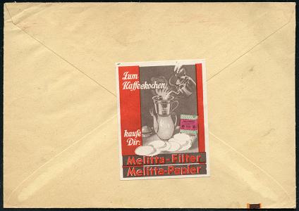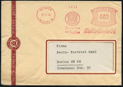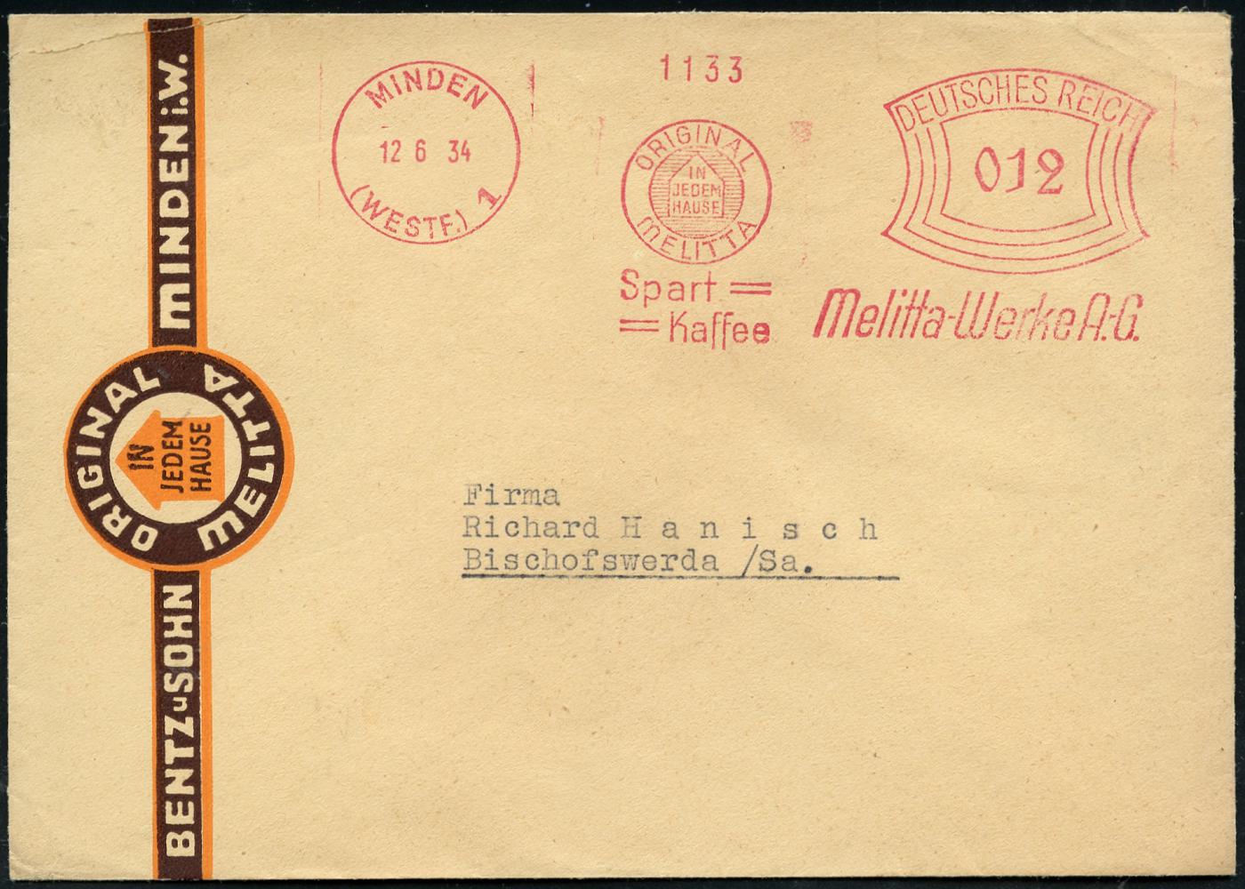 8843 | 25 € | PL-Raum 49.. (ohne Herford) : MINDEN/ (WESTF.)1/ ORIGINAL/ MELITTA/ Spart/ Kaffee.. 1932 (4.10.) AFS Francotyp "Bogenrechteck" (Firmen-Logo) motivgl. Firmen-Bf. (kl. Eckseitenriß geschl.) + rs. dekorative Reklame-Vignette: Zum Kaffeekochen.. Melitta-Filter.. (Dü.E-1CEh) | ![]() ![]() | |