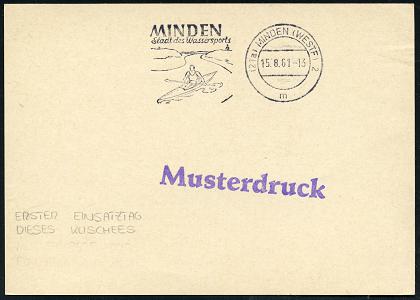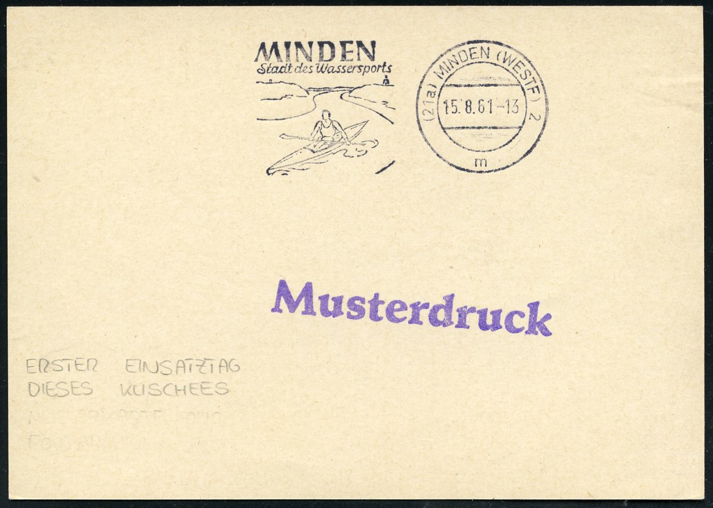 8851 | 18 € | PL-Raum 49.. (ohne Herford) : (21a) MINDEN (WESTF)2/ m/ Stadt des Wassersports 1961 (15.8.) MWSt = Einer-Kajak + 1L: Musterdruck, klar gest. OPD-Archiv-Musterkt. vom Ersttag! (Bo.7 A I, nur Mitte 1961-1962 verwendet) | ![]() | |