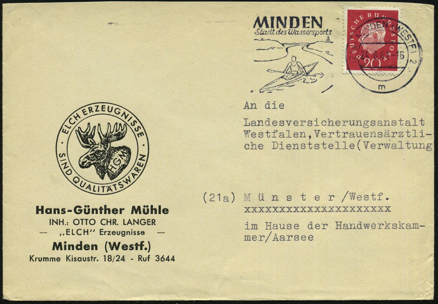 8852 | 15 € | PL-Raum 49.. (ohne Herford) : (21a) MINDEN(WESTF)2/ m/ Stadt des Wassersports 1961 (24.8.) MWSt = Kajak Einer , klar gest., dekorativer Firmen-Bf.: Hans-Günther Mühle.. ELCH ERZEUGNISSE.. (Bo.7 A I, nur Mitte 1961-62 verwendet) | ![]() | |