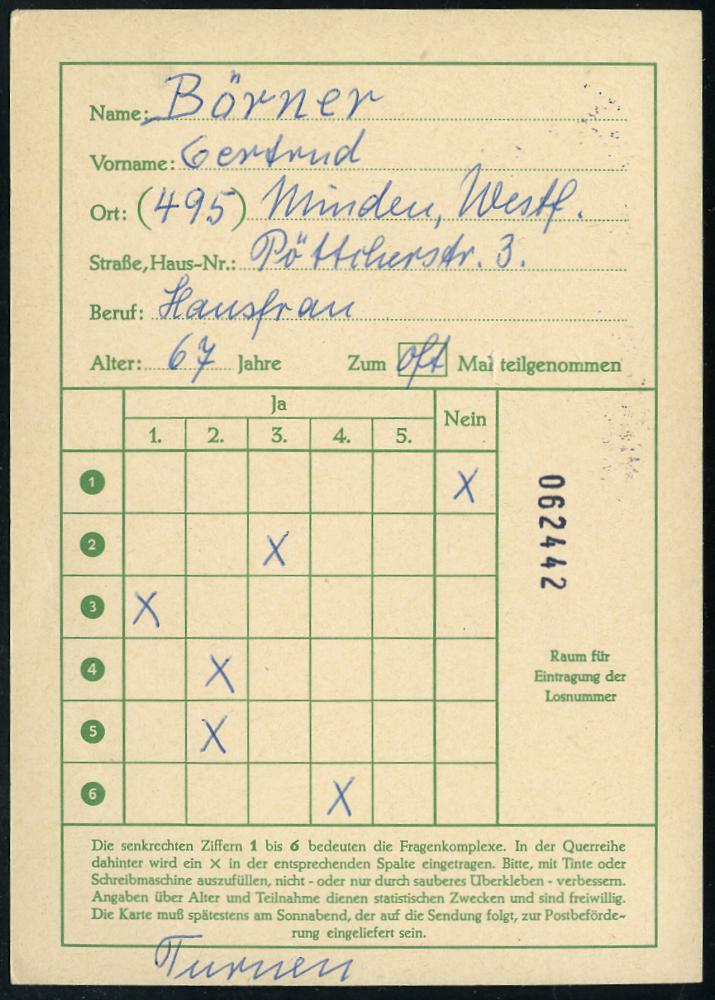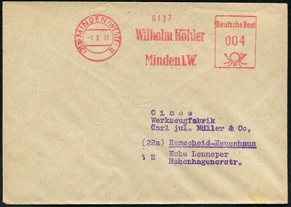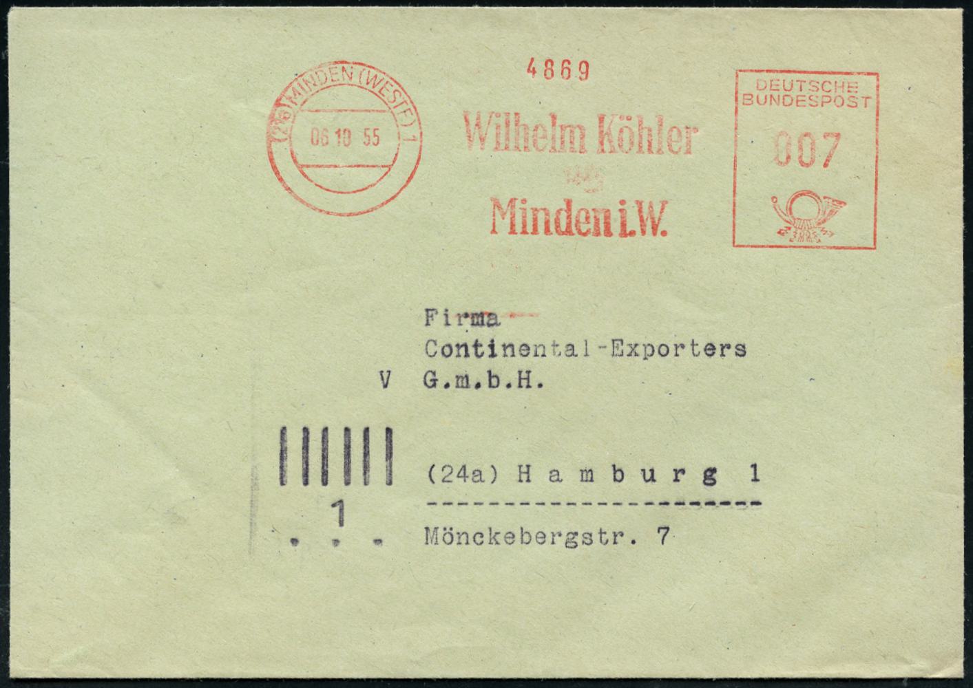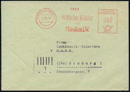 8850 | 15 € | PL-Raum 49.. (ohne Herford) : (21a) MINDEN (WESTF)/ Wilhelm Köhler.. 1955 (6.10.) aptierter AFS Francotyp mit alter Zählnr., 2. Textzeile "VERLAG" + 4. Textzeile "Köhlers Flottenkalender" entfernt , Fern-Bf., vergl. Kat.-Nr. 8842, 8844 u. 8847 (Dü.E-23COh) | ![]() | |