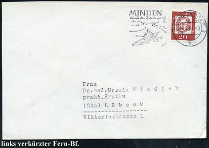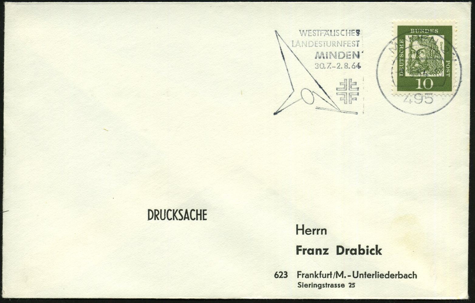 8855 | 12 € | PL-Raum 49.. (ohne Herford) : 495 MINDEN 1/ c/ WESTFÄLISCHES/ LANDESTURNFEST.. 1964 (6.5.) MWSt (stilis. Turner u. "FFFF") klar gest. Inl.-Bf. (Bo.9 A) | ![]() | |