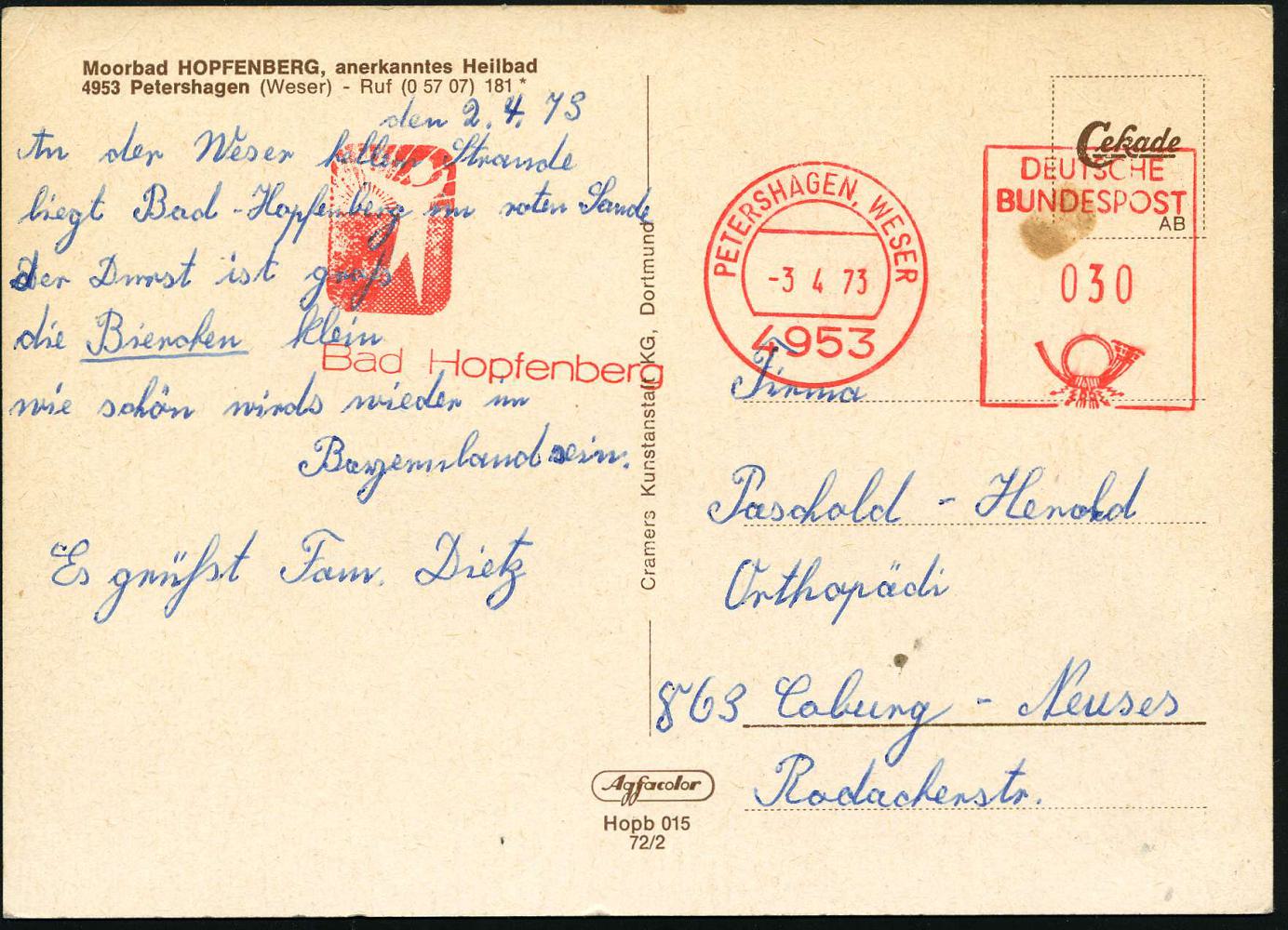 8863 | 15 € | PL-Raum 49.. (ohne Herford) : 4953 PETERSHAGEN,WESER/ Bad Hopfenberg 1973 (3.4.) AFS Postalia 030 Pf., unzulässige , private Nutzung eines Kommunalen AFS (handgeschrieben, kl. Fleckchen) Color-Foto-Ak.: Moorbad HOFFENBERG.. n. Coburg (Dü.E-26 B) | ![]() ![]() ![]() | |
