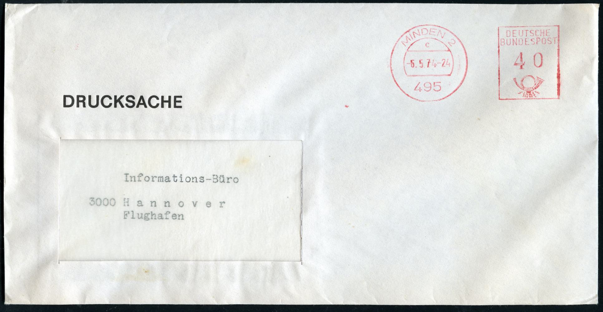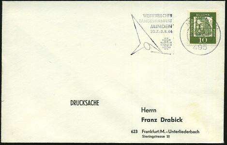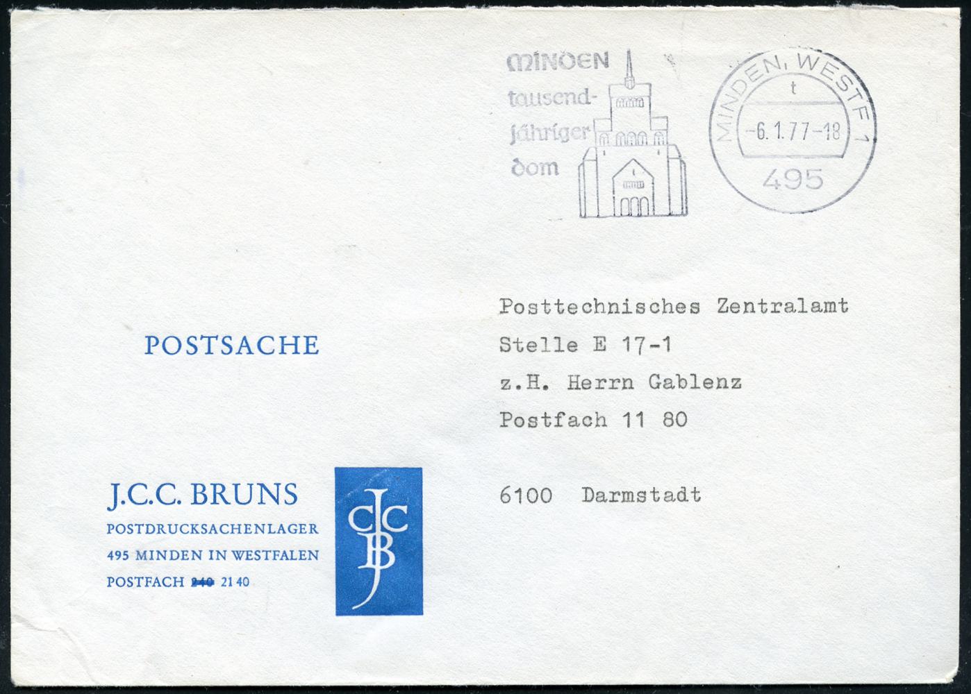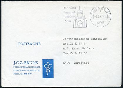 8859 | 15 € | PL-Raum 49.. (ohne Herford) : 495 MINDEN,WESTF 1/ r/ tausendjähr./ Dom 1974 MWSt (roman. Dom) auf Firmen-Bf.: J.C.C. BRUNS, POSTDRUCKSACHEN-LAGER unfrankiert als Postdienstbf. an das PTZ, Darmstadt | ![]() | |