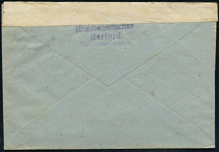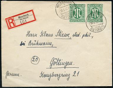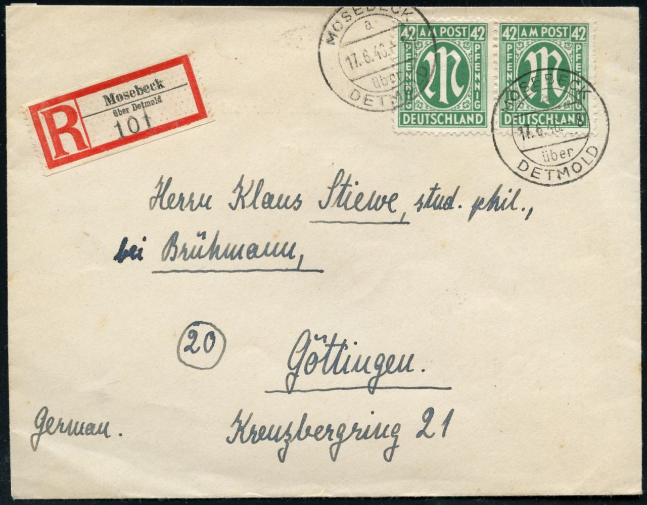 8861 | 25 € | PL-Raum 49.. (ohne Herford) : MOSEBECK/ a/ über/ DETMOLD 1946 (17.6.) 2K-Steg = PSt.I + RZ: Mosebeck/über Detmold = PSt.I , Frankatur Paar AM-Post 42 Pf., Fern-R-Bf. n. Göttingen, rs. AS. (Mi.31 MeF) | ![]() | |