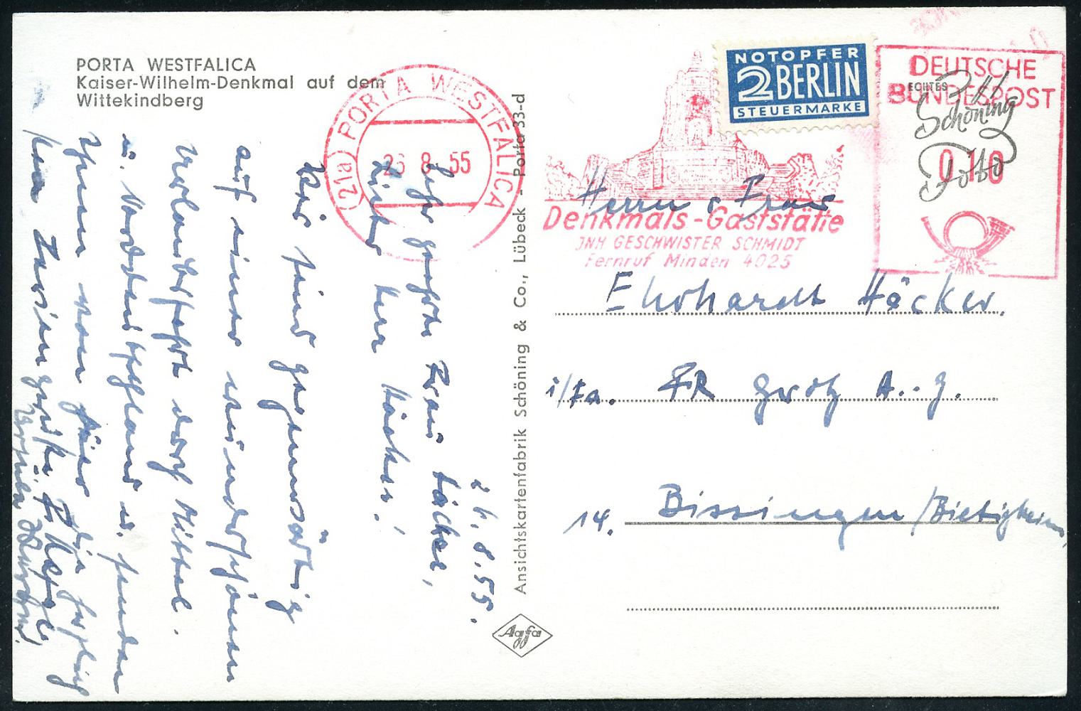 8866 | 20 € | PL-Raum 49.. (ohne Herford) : (21a) PORTA WESTFALICA/ Denkmals-Gaststätte/ JNH.GESCHW.SCHMIDT 1956 (23.6.) AFS Postalia = Kaiser Wilhelm I.-Denkmal = Hauspostamt Ausflugs-Lokal , motivgl. s/w.-Foto-Ak.: Wilhelm I.-Denkmal = Fremdnutzung Firmen-Freistempels durch einen Gast + 2 Pf. NoB nachträgl. zugeklebt, Bedarf n. Bissingen/Wttbg. (Dü.E-23 B) | ![]() ![]() ![]() | |