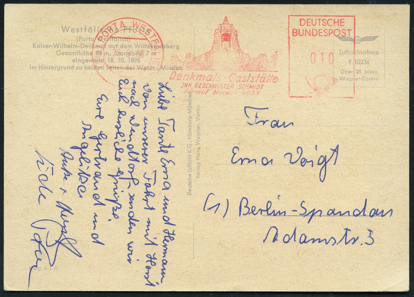 8868 | 20 € | PL-Raum 49.. (ohne Herford) : (21a) PORTA WESTFALICA/ Denkmals-Gaststätte/ JNH.GESCHW.SCHMIDT 1960 (29.5.) AFS Postalia = Kaiser Wilhelm I.-Denkmal = Hauspostamt Ausflugs-Lokal , motivgl. Color-Foto-Ak.: Wilhelm I.-Denkmal = Fremdnutzung Firmen-Freistempels durch einen Gast, Bedarf n. West-Berlin (Dü.E-23 B) | ![]() ![]() ![]() | |