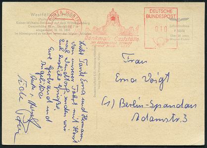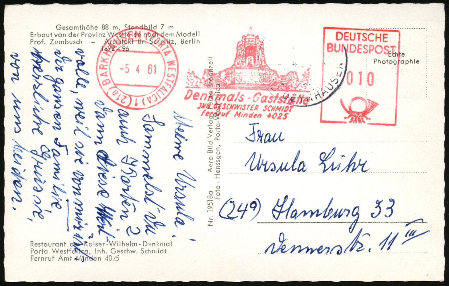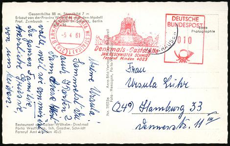 8765 | 18 € | PL-Raum 49.. (ohne Herford) : (21a) BARKHAUSEN (PORTA WESTFALICA)1/ Denkmals-Gaststätte/ JNH.GESCHW.SCHMIDT 1961 (5.4.) AFS Postalia = Kaiser Wilhelm I.-Denkmal , vorausfrankierte, motivgl. s/w.-Foto-Ak.: Kaiser Wilhelm-Denkmal (beim Verkauf bereits frankiert, vergl. Kat.-Nr. 8766 etc.) = zulässige Fremdnutzung eines Firmenfreistemplers! (Dü.E-23B, vergl. Kat.-Nr.8766, 8865-68) | ![]() ![]() ![]() | |