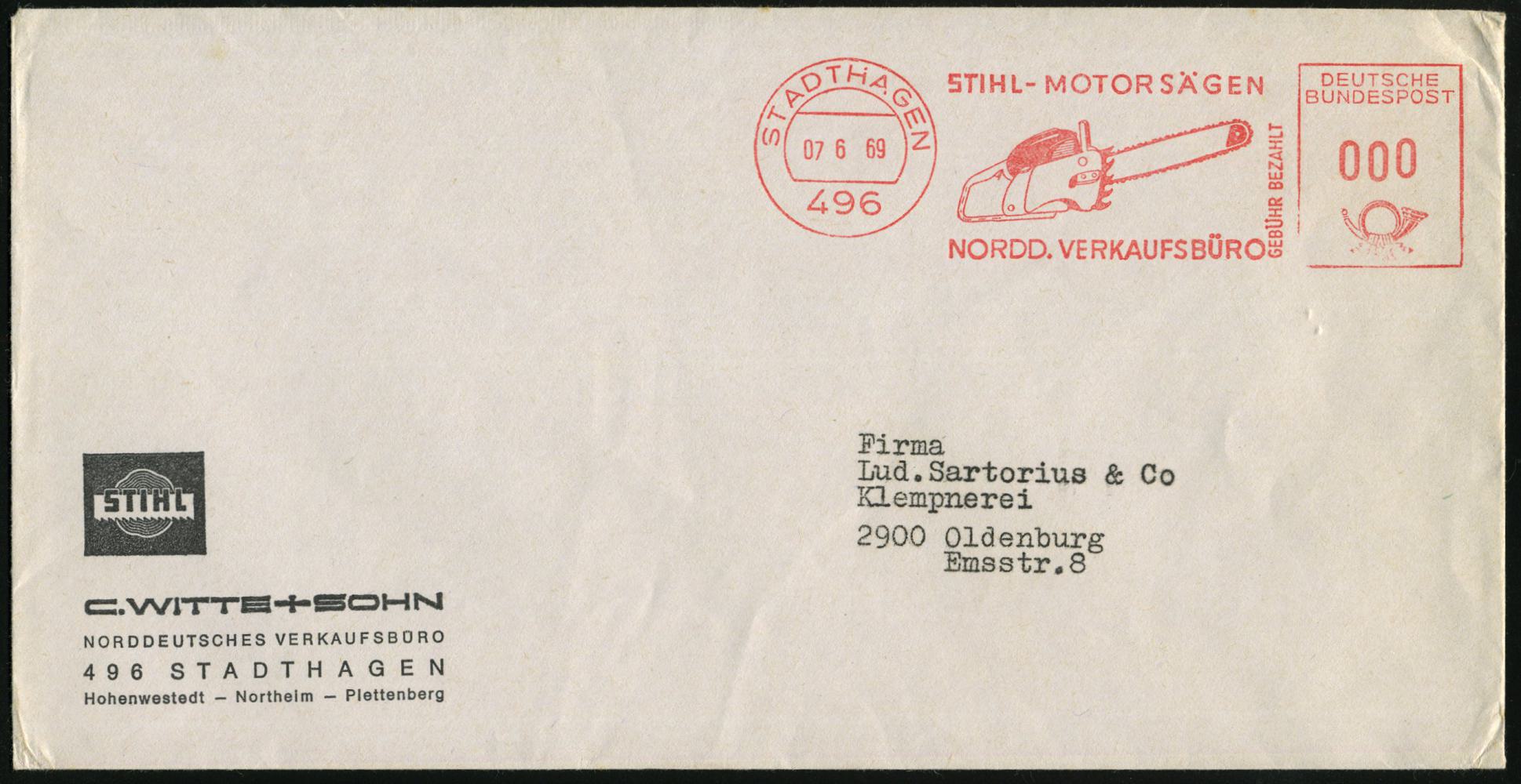 8875 | 12 € | PL-Raum 49.. (ohne Herford) : 496 STADTHAGEN/ STIHL-MOTORSÄGEN/ GEBÜHR BEZAHLT 1969 (7.6.) AFS Francotpy 000 Pf. = Massen-Drs. (vorschriftsmäßig bis 30.9.1969) Motiv: Motorsäge, Firmen-Bf.: STIHL, C. WITTE + SOHN.. (Dü.E-23CO) | ![]() | |