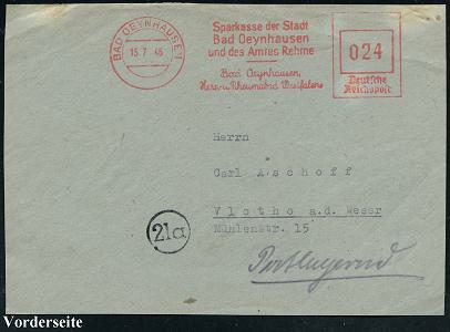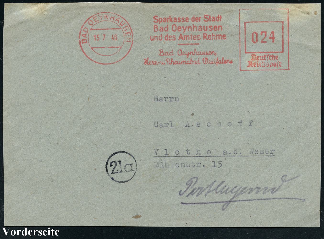 8750 | 16 € | PL-Raum 49.. (ohne Herford) : BAD OEYNHAUSEN/ Sparkasse der Stadt/ Bad Oeynhausen../ Herz- u. Rheumabad.. 1946 (15.7.) aptierter AFS Francotyp "Reichsadler" = entfernt = Notmaßnahme! , Bedarfs-Vorderseite (oben kl. Randfleck) (Dü.E-13 J-129o) | ![]() | |