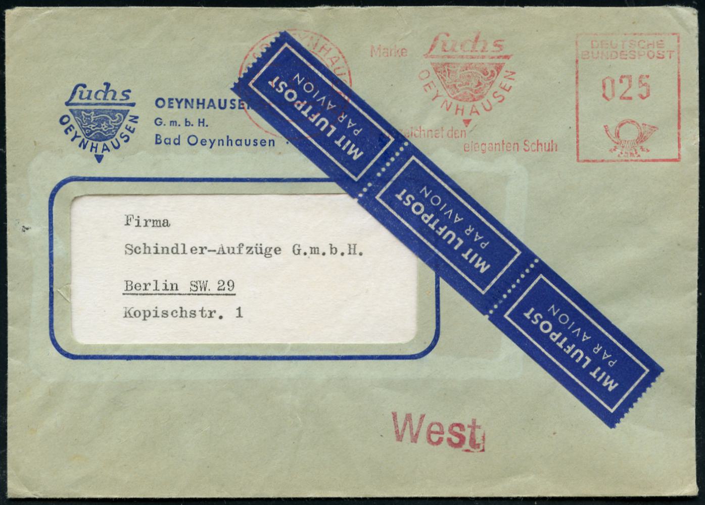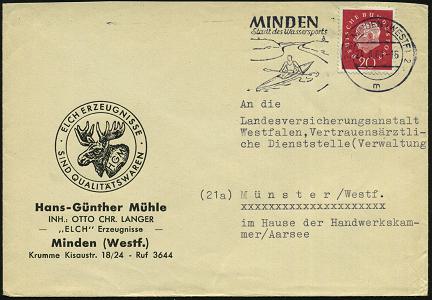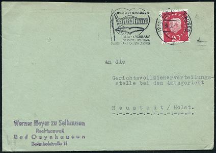 8751 | 25 € | PL-Raum 49.. (ohne Herford) : (21a) BAD OEYNHAUSEN/ Marke Luchs/ Bezeichnet den/ eleganten Schuh 1955 (17.5.) AFS Francotyp "Posthorn" 025 Pf. (Logo: liegender Luchs) motivgl. Inl.-Flp.-Firmen-Bf., notopferbefreit n. West-Berlin (Dü.E-23CG) | ![]() | |